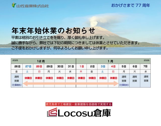 平素よりLocosu倉庫に格別のご愛顧を賜り、厚く御礼申し上げます。 誠に勝手ながら、弊社では下記の期間を年末年始の休業期間とさせていただきます。 【休業期間】 2025年12月27日(土) ....